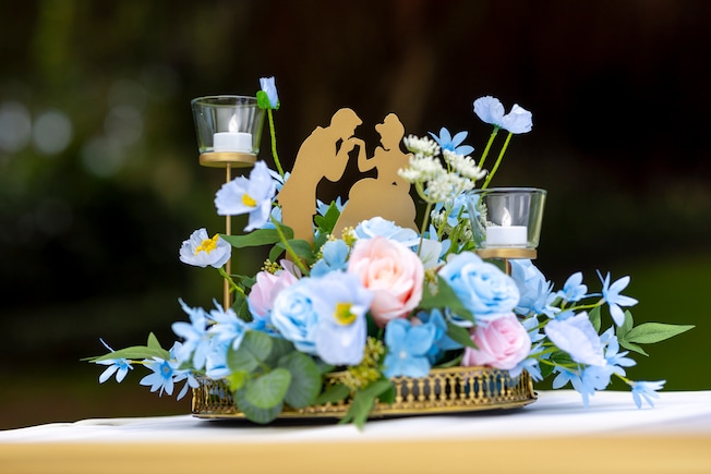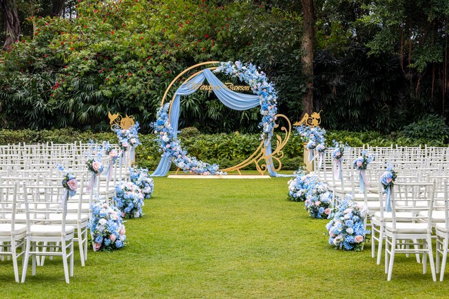 Walking on the soft green grass field with pale blue floral on the side, it seems to be a pathway towards a fairy tale. Immerse in the Cinderella ambience and embrace the romantic fable with the pumpkin coach and glass slippers in the floral arch.