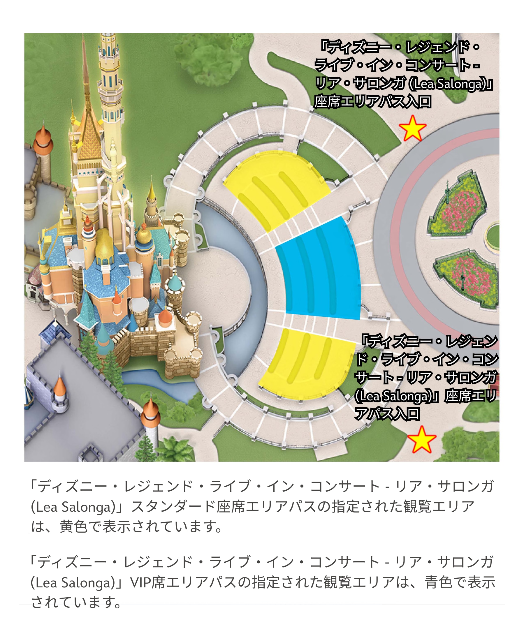 「ディズニー・レジェンド・ライブ・イン・コンサート – リア・サロンガ (Lea Salonga)」座席エリアパスをご購入いただくと、キャッスル・ステージ前の指定席エリアにお席を確保できます。リー・サロンガの息を呑むような歌声に酔いしれ、音楽と魔法が紡ぐ忘れられない思い出をまたひとつ作りましょう!