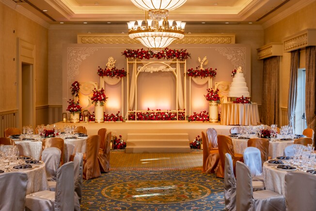 细意刻画您俩与众不同的美丽情缘,场内的大型LED屏幕呈现每个甜蜜时刻,让宾客一起见证您俩的爱情故事以及赏心悦目的鲜花摆设定能令您的婚宴绽放异彩。