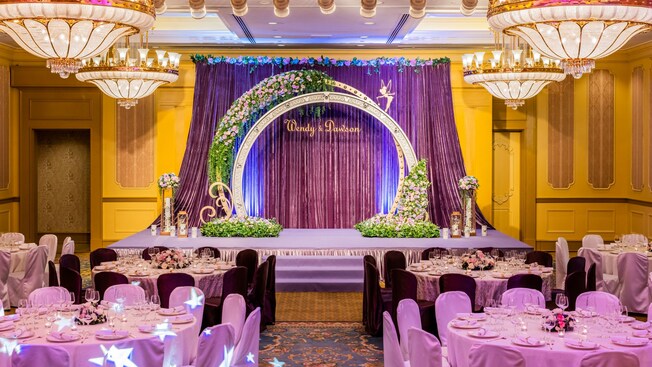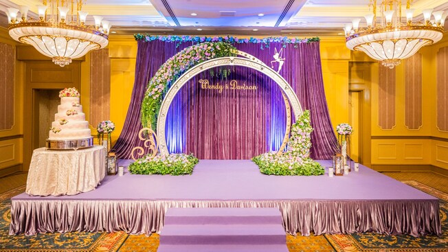 舞台在亮丽高贵的紫色绸幕映衬下,以婚戒布置为主题,戒指上的奇妙仙子装饰恍如迎接您俩迈进幸福之门,配合精致花卉作点缀,令宴会厅弥漫着浪漫温馨的气氛。