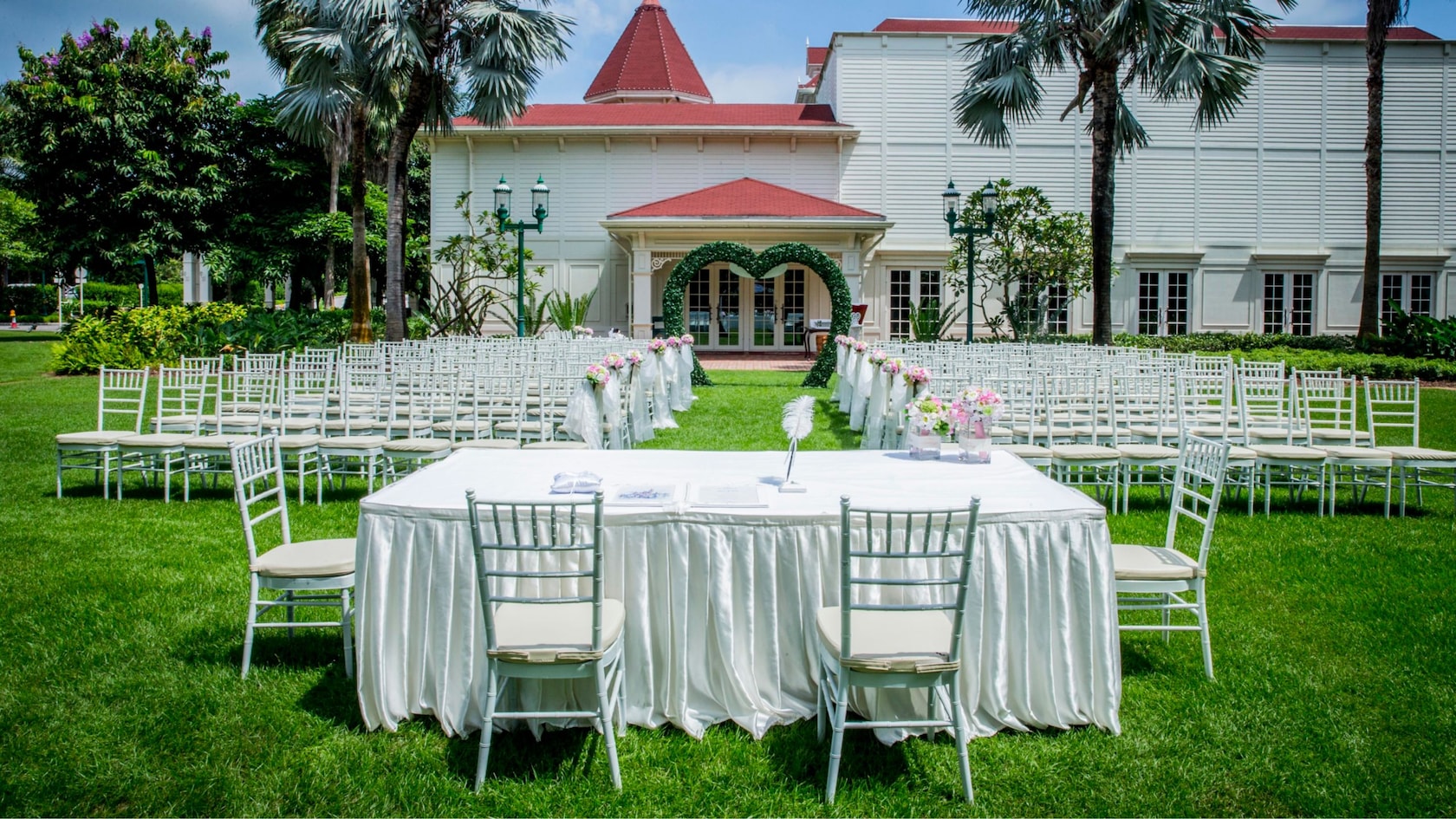 和煦的阳光洒落在茵绿草坪上,引领新人步进迪士尼精心缔造的户外证婚庭园,以爱和包容来迎接人生重要的一天,见证永恒婚姻的真缔。