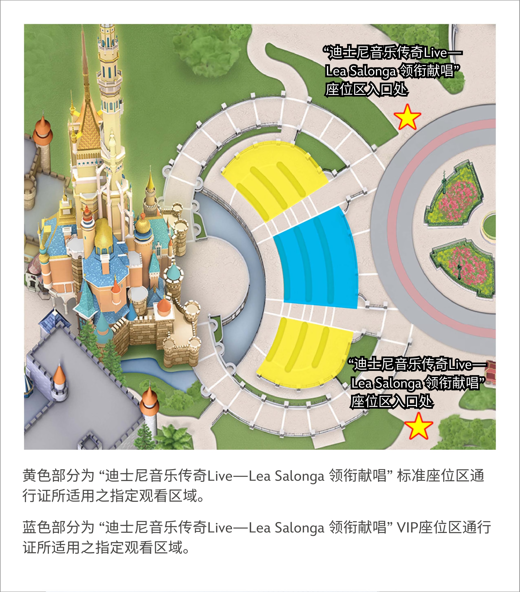 购买“迪士尼音乐传奇Live — Lea Salonga 领衔献唱”座位区通行证,宾客可安坐于城堡舞台前的指定座位区,细听Lea Salonga的绝美的嗓音!