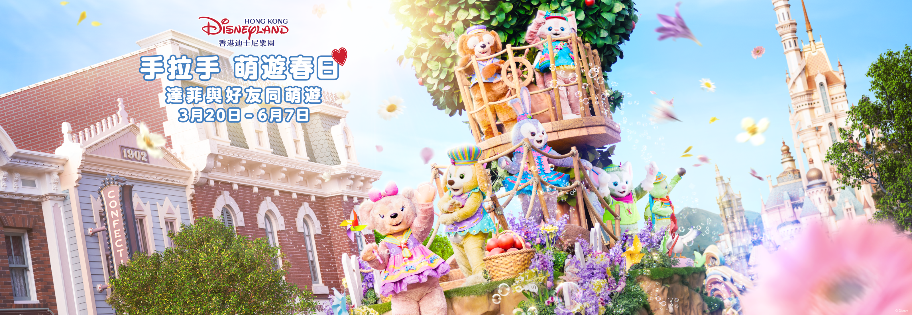 在換上全新春日主題裝飾的達菲與好友遊玩屋內,7位達菲與好友亦會以煥然一新的春季水手裝,在屋內與你擁抱、互動再合照!