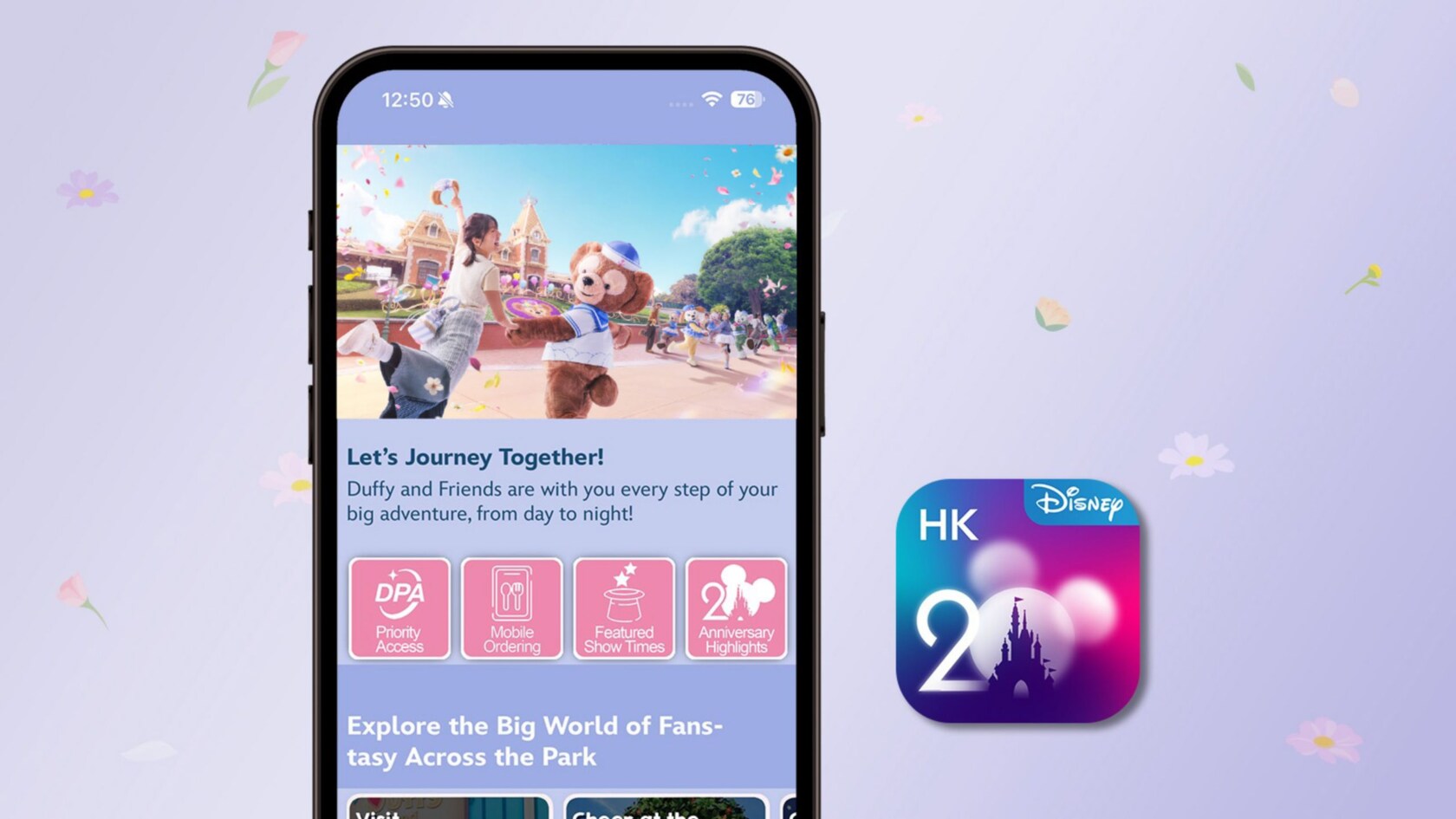 下載香港迪士尼樂園的官方手機應用程式,獲取遊歷及遊樂設施的最新消息,盡情投入年度盛事Duffy與好友同萌遊!
