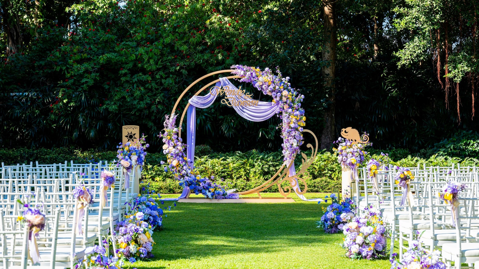 柔和的淡紫色佈置映襯著藍天綠茵,浪漫而唯美。綠植簇擁著粉紫色的花,更添夢幻的田園氣息。裝飾設計有著《魔髮奇緣》中長髮公主樂佩的忠實夥伴變色龍巴斯高,還有象徵著希望、愛情和期盼的天燈,營造出浪漫的氛圍。