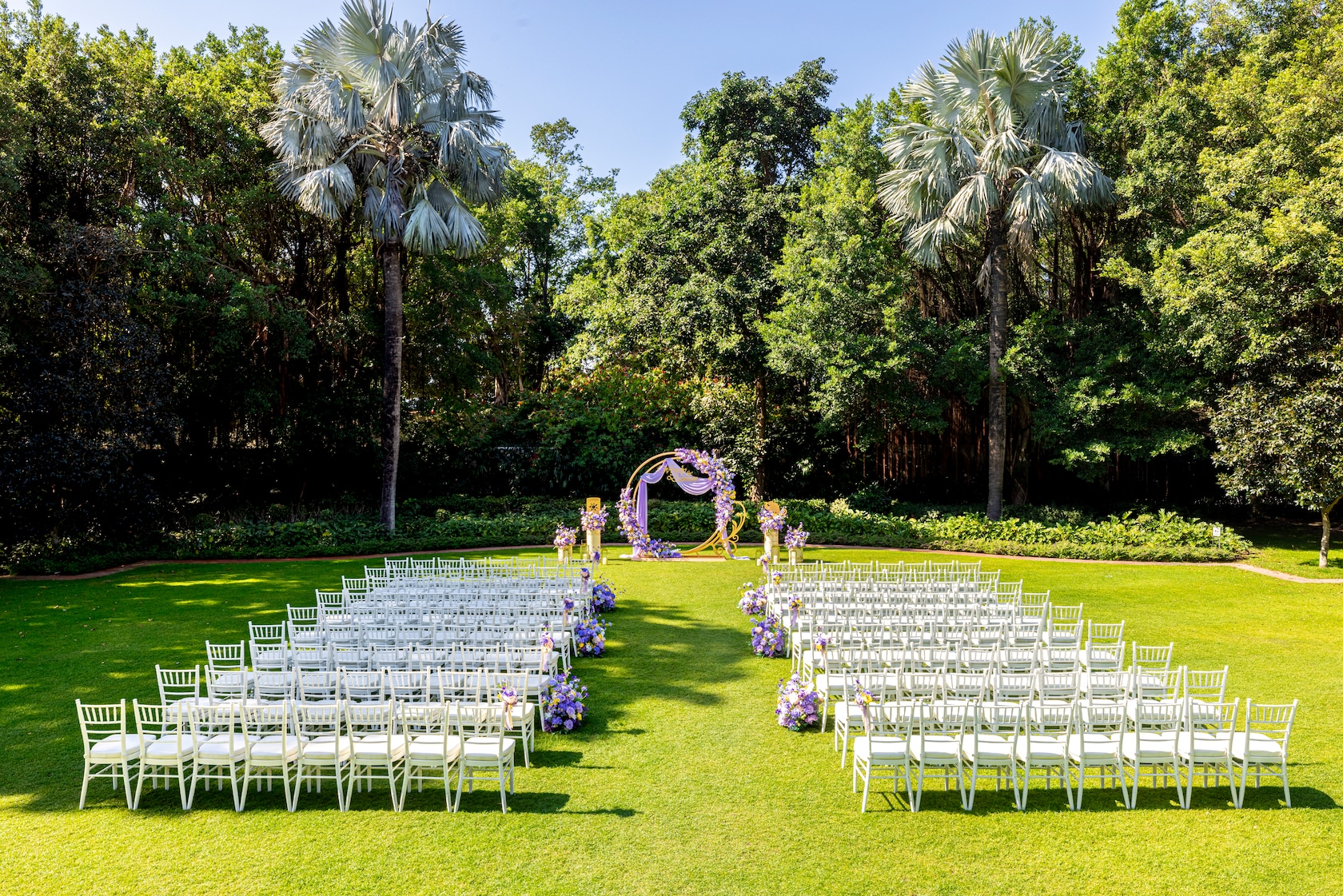 在摯愛親朋見證下,一雙戀人置身優雅的園林,以翠巒綠蔭與浪漫花海當背景,共證山盟海誓。