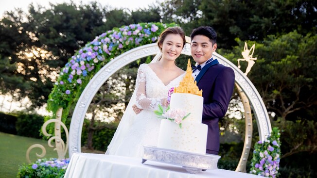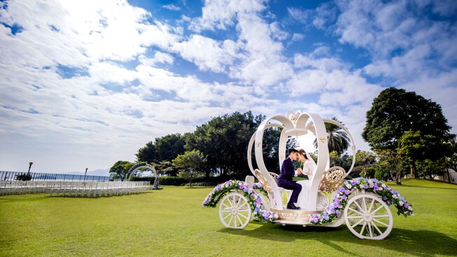 隨著悠悠響起的結婚樂曲,新人攜手邁向瑰麗閃爍的結婚戒指拱門。在奇妙仙子裝飾的見證下,為對方戴上婚戒,注入滿滿的愛意,並許下廝守一生的承諾。登上典雅的南瓜車,猶如迪士尼故事中的公主與王子,從此過著幸福快樂的日子。 套餐詳情,請聯絡我們的婚禮統籌專家: