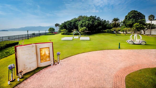 奇妙星粉灑落在充滿童話園林氣息的證婚庭園,以童話式迎賓故事書為新人的婚禮揭開序幕。書頁上映照出城堡的剪影,並寫上你倆的名字,讓新人彷如踏進「Happily Ever After」的經典童話場景。