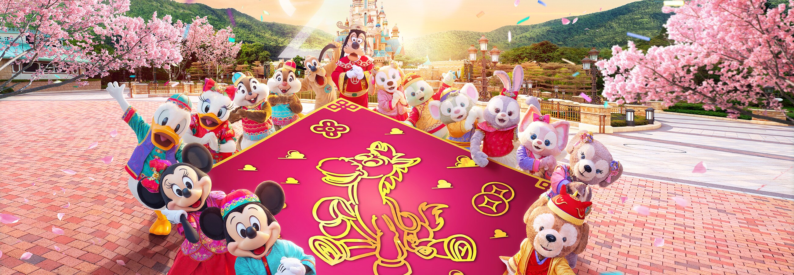 你最喜愛的財神高飛、米奇老鼠、米妮老鼠、唐老鴨、黛絲、高飛、布魯托及鋼牙奇奇與大鼻帝帝已穿起賀年裝,期待與你熱切相擁,快樂團聚!